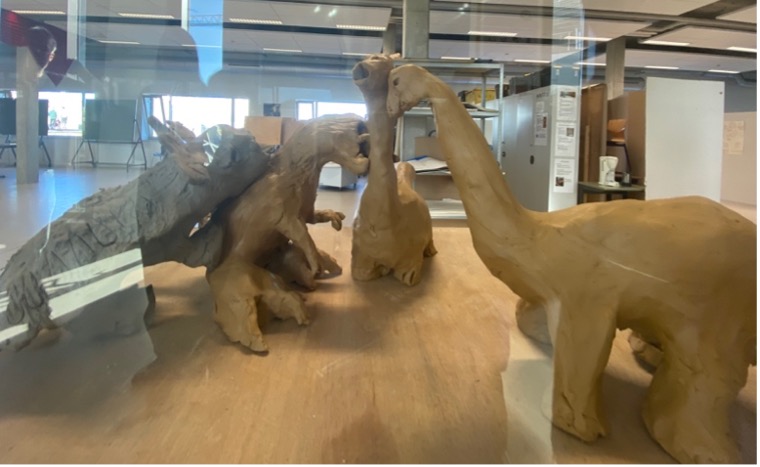 Tijdens deze les ontdekten we de mogelijkheden van klei. Samen gaven we vorm aan fantasierijke dino's: iedereen begon met een deel en schoof daarna door, zodat de volgende het werk kon verderzetten. Zo groeiden er unieke groepscreaties uit samenwerking en verbeelding. We sloten af met korte verhalen over onze dino's.