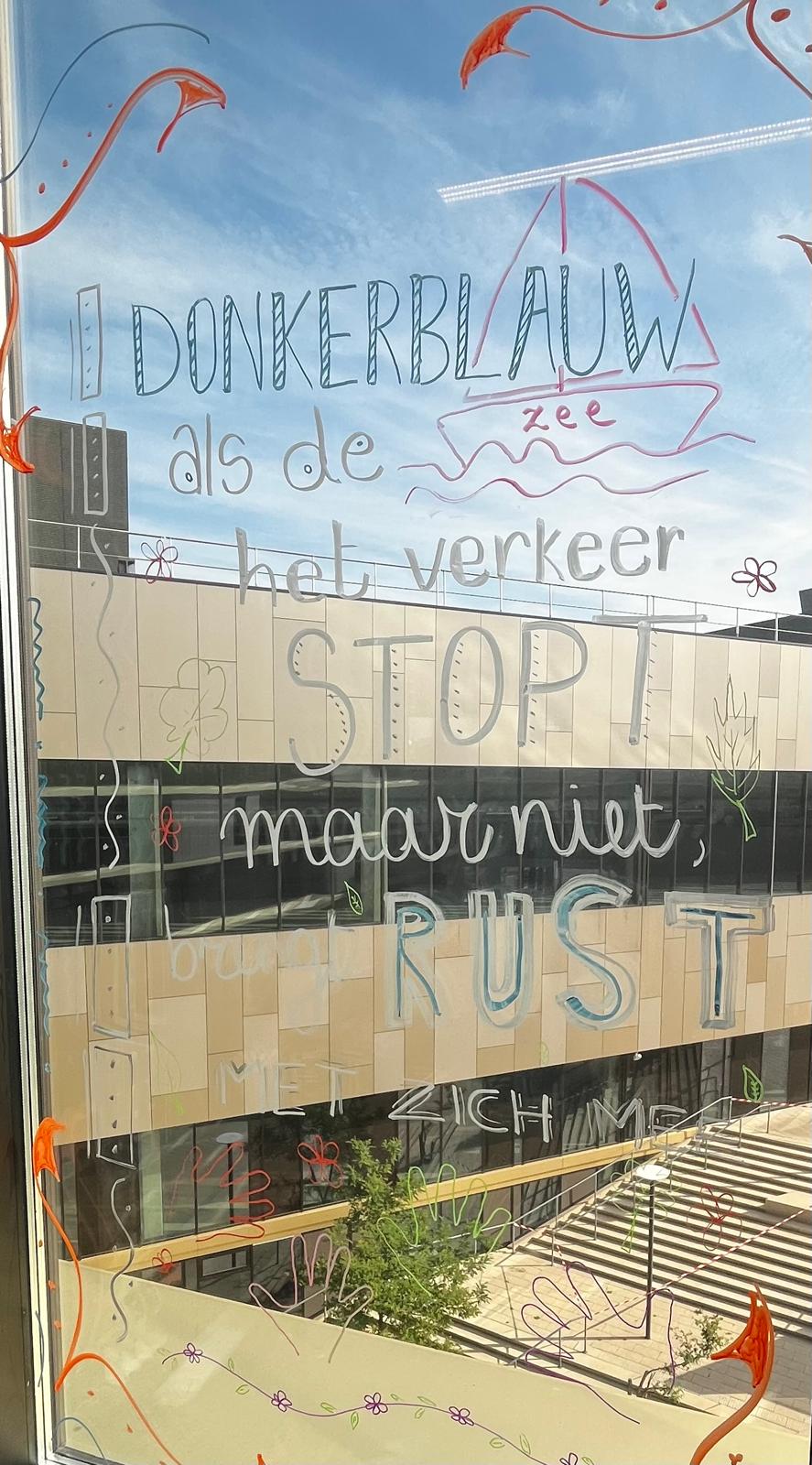 We lieten ons inspireren door een afbeelding en vertaalden die in woorden. Via een 5-minuten-gedicht ontdekten we hoe kunst en taal elkaar kunnen versterken. Daarna oefenden we met handlettering, ontwierpen ons eigen krijtgedicht en brachten het tot leven op het raam in het X gebouw, poëzie in beeld en kleur.